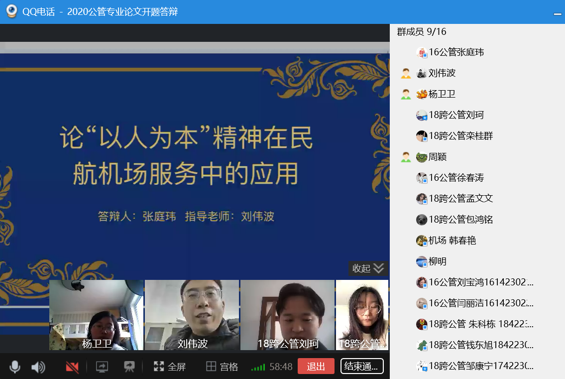 根据学校防疫期间教学工作停课不停学的工作要求,以及《suncitygroup太阳成集团2020届毕业论文工作实施方案》,suncitygroup太阳成集团于3月4日至6日开展了2020届本科毕业生线上开题答辩工作。交通运输(机场运行与管理方向)、公共事业管理2个专业共109名毕业生分成7个答辩小组,通过QQ群视频或钉钉会议等进行了开题答辩。学院教学督导组主要成员加入各答辩群对答辩过程进行监控和督导。