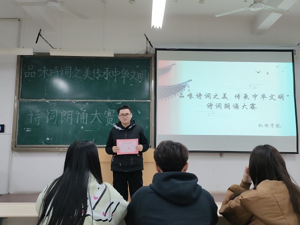 为提高同学们的人文素质和道德情操,进一步弘扬中华民族优秀传统文化,推动校园文化建设,12月8日晚,我院于工科楼2-112教室举办“品味诗词之美,传承中华文化”诗词朗诵比赛。我院学生评委团及2021级全体同学到场参加了本次活动。