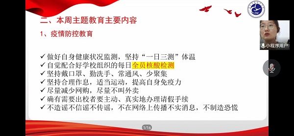 会议主要分为主题教育以及工作安排两大部分。首先,就日益严峻的疫情形势,会上做疫情防控教育,强调严格落实疫情相关要求,严格实施“学生非必要不外出”,有紧急情况需要找辅导员请假并及时销假,自觉配合好学校组织的每日全员核酸检测工作,尽量减少网购和外卖数量。接着,会议对本周工作做出进一步的部署与安排,鼓励大家关注山东教育发布平台,便于师生第一时间接受教育信息;获得奖学金的同学及时上报银行卡卡号,进一步展开后续工作;统计学业困难情况,做好学生的学业指导与困难帮扶,及时帮助学生调整,以避免学业困难问题的产生;鼓励大家积极参加创新型比赛,拓宽视野;提醒同学们注重英语的学习,尽快通过四六级考试,为以后考研或者工作打好基础等等。最后,会议对网络文明和网络安全教育做进一步的强调与说明,并指出网络安全对于总体安全来说具有“牵一发而动全身”的地位,要求学生不在网上传播不实信息,不在网络上点击陌生链接和不良网站。至此,本次全员线上会议圆满结束。