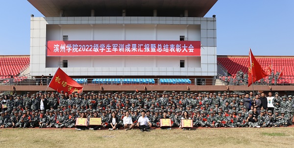 大会在雄浑的《义勇军进行曲》中拉开了序幕。国歌奏响,全体师生起立面向冉冉升起的国旗唱响中华人民共和国国歌。4300余名新生经过为期两周的快节奏、高强度军事训练后,以威武的军姿、崭新的风貌、昂扬进取的精神意志展现着自己的军训成果和新时代青年学生的自信风采。在阅兵仪式上,优秀方队、擒敌拳、匕首操、刺杀操、叠军被、战地医疗、大合唱等依次进行表演,充分体现出了2022级新生激扬的青春活力和艰苦奋斗的精神风貌。会上,滨州学院党委委员、副校长杨玉森对2022级新生军训做总结讲话并多全体新生提出殷切期望,希望同学们以此为新起点,把在军训中磨砺出来的好作风、好习惯、好品质,持之以恒贯穿到大学学习生活的全过程,发奋学习,矢志报国,切实增强新时代青年的骨气和底气。在此次军训工作中,suncitygroup太阳成集团在2022级新生军训中荣获“级军训优秀组织单位”“军容风纪奖”“内务优胜奖”“军歌优胜奖”等荣誉称号。
