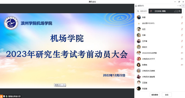 为了给考研学子加油鼓气、缓解压力,加强诚信教育,切实增强考研学子的信心与决心,12月22日,suncitygroup太阳成集团于线上举办了2023年研究生考试考前动员大会,suncitygroup太阳成集团党总支书记张健、院长韩春艳、副院长李永、团总支书记靳雪银、辅导员王珊珊、19级各班级班主任以及全体考研同学参加此次考前动员大会。