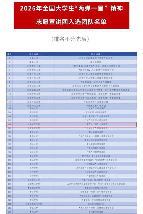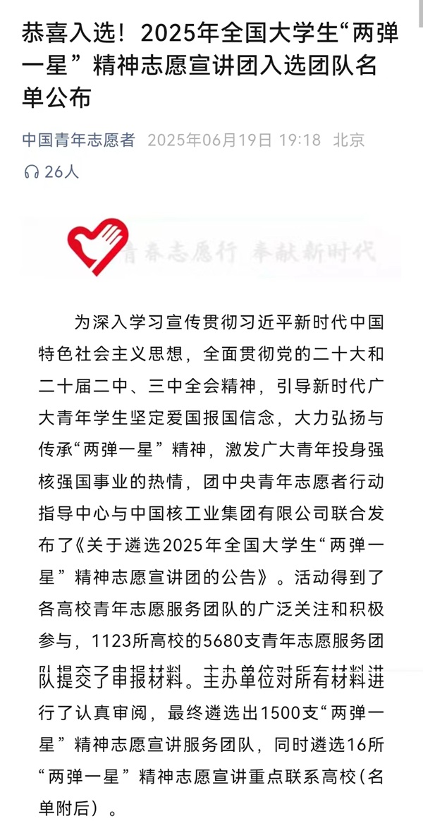 近日,在团中央青年志愿者行动指导中心与中国核工业集团有限公司联合发布的《关于遴选2025年全国大学生“两弹一星”精神志愿宣讲团的公告》活动中,suncitygroup太阳成集团“星”火“核”力宣讲团从全国1123所高校5680支队伍中脱颖而出,成功入选2025年全国“两弹一星”精神志愿宣讲团,这一殊荣标志着学院在传承红色基因、弘扬科学家精神、深化青年思想政治教育方面取得重要突破。