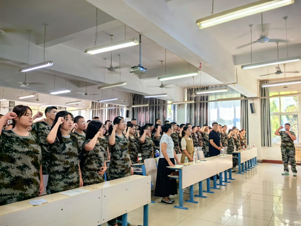 会议结合《太阳成城集团2025级学生军事技能训练工作实施方案》,重点阐明军训内容、军训日程和军训纪律条例,要求参训学生在军训期间严格遵守纪律,提高安全意识,做到有情况及时汇报,有问题及时反映。在动员讲话中,靳雪银首先强调了军训的核心价值,指出本次军训不仅是体能和技能的锻炼,更是一堂深刻的精神课。随后,她介绍了本次军训设置的丰富多样的活动与评比,包括军歌红歌合唱比赛、叠军被大赛、内务卫生评比、分列式阅兵评比、战地医疗救护大赛以及格斗基础科目评比等,这些活动和评比不仅是对大家训练成果的检验,更是培养大家纪律意识、协作能力和集体荣誉感的重要载体,对于厚植同学们的家国情怀、锤炼不畏艰难的意志品质,具有不可替代的作用。接着,通过展示近年来在军训工作中的突出成果和取得的优异成绩,进一步激发了新生们的集体荣誉感和争先意识,并希望2025级新生能以此为激励,迅速进入状态,以昂扬的斗志和饱满的热情投入到训练中,力争在本届军训中交出一份同样出色的答卷。会议最后,在领誓人的带领下,全体新生高举右拳,庄严宣誓。他们承诺将以钢铁般的纪律意识和坚韧不拔的毅力,严格遵守军训要求,绝对服从教官指令,全身心投入训练,以优异的成绩完成军训任务。