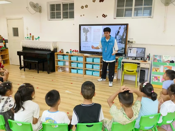 他始终秉持知行合一的理念,主动挺膺担当。入学至今,他积极参与纪念抗战胜利80周年红色宣讲、乡村振兴志愿工作等各类实践活动,在服务他人与社会的过程中,切实贡献着自己的青春力量。尤其值得一提的是,2025年暑期,他有幸加入全国大学生“两弹一星”精神志愿宣讲国家级宣讲团队——“星”火“核”力宣讲团。作为团队核心成员,他随团队赴山东12个地市开展了22场宣讲,为1000余名听众生动传递“两弹一星”精神。期间,他还走进滨州华美幼儿园、烟台向阳幼儿园,为小朋友们讲述“两弹一星”精神功勋人物的故事。当看到台下小朋友们的眼神从最初的懵懂逐渐变得坚定时,强烈的责任感瞬间在他心中升腾。